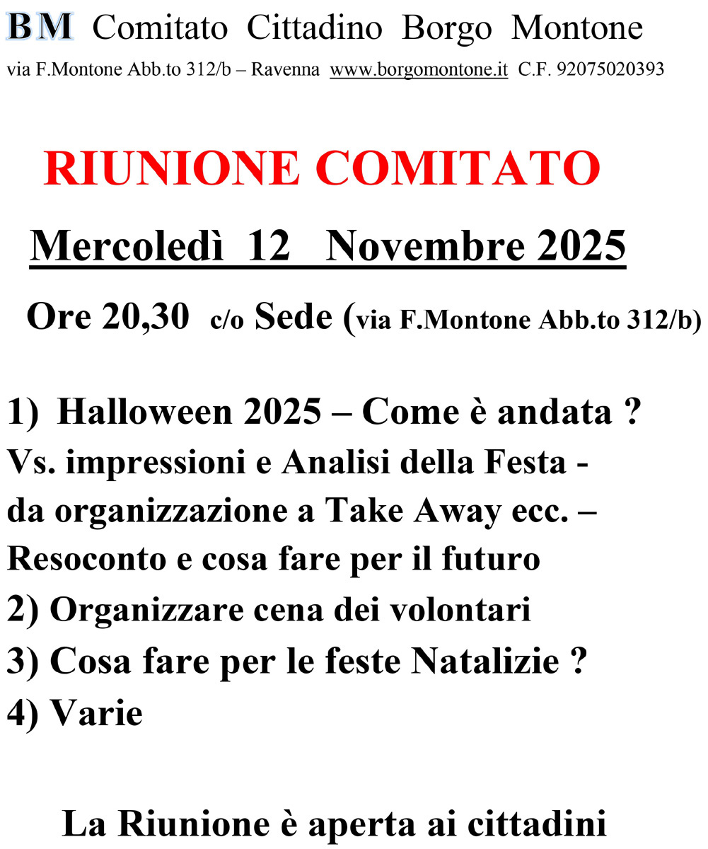 Questa è la convocazione dell'ultima riunione del Comitato Cittadino di Borgo Montone. Per visualizzare le precedenti (da gennaio 2010) cliccare sui sottomenù della pagina "Riunione Comitato Cittadino" del menù Borgo Montone.